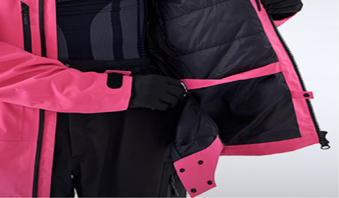 Pockets: Handwarmer pockets, sleeve pass pocket, chest zipper pockets, internal goggle pocket