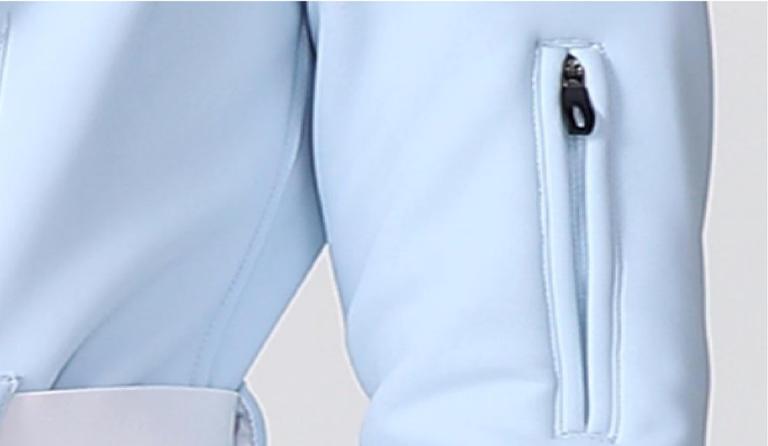 Pockets: Handwarmer pockets, chest zipper pocket, and sleeve pass pocket