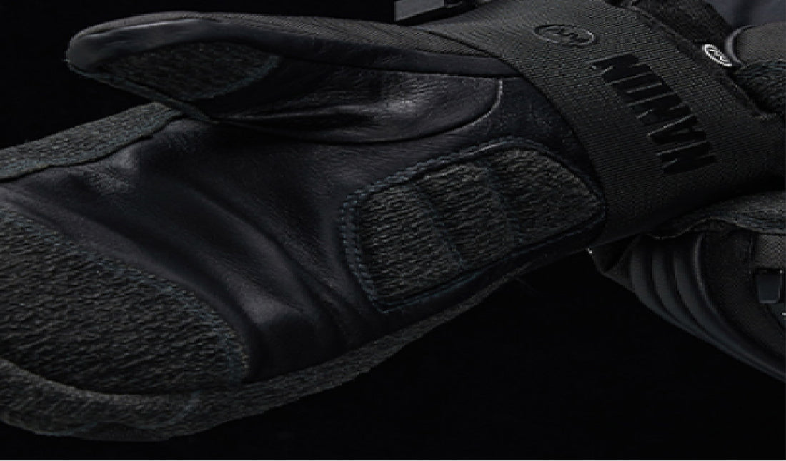 Kevlar reinforcement placed on high-wear zones: palms, fingertips, and grip area